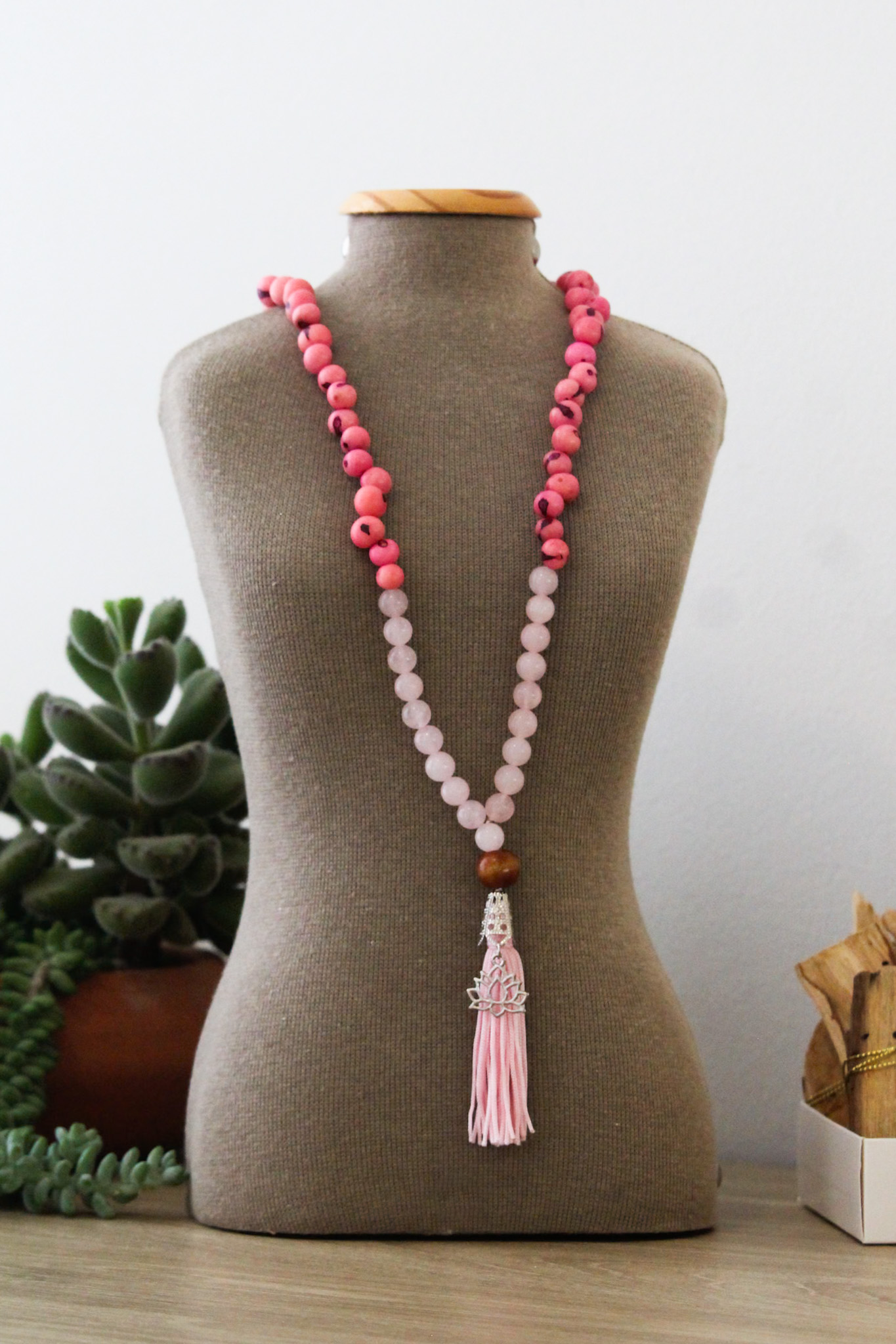O japamala amor é feito com 108 contas de sementes de açaí, pedras naturais de quartzo rosa e pingente de flor de lótus, uma peça que transmite muita leveza, acolhimento e amor. A cor rosa representa romantismo, ternura, beleza, suavidade e delicadeza, é a cor das emoções, dos afetos e do romance.