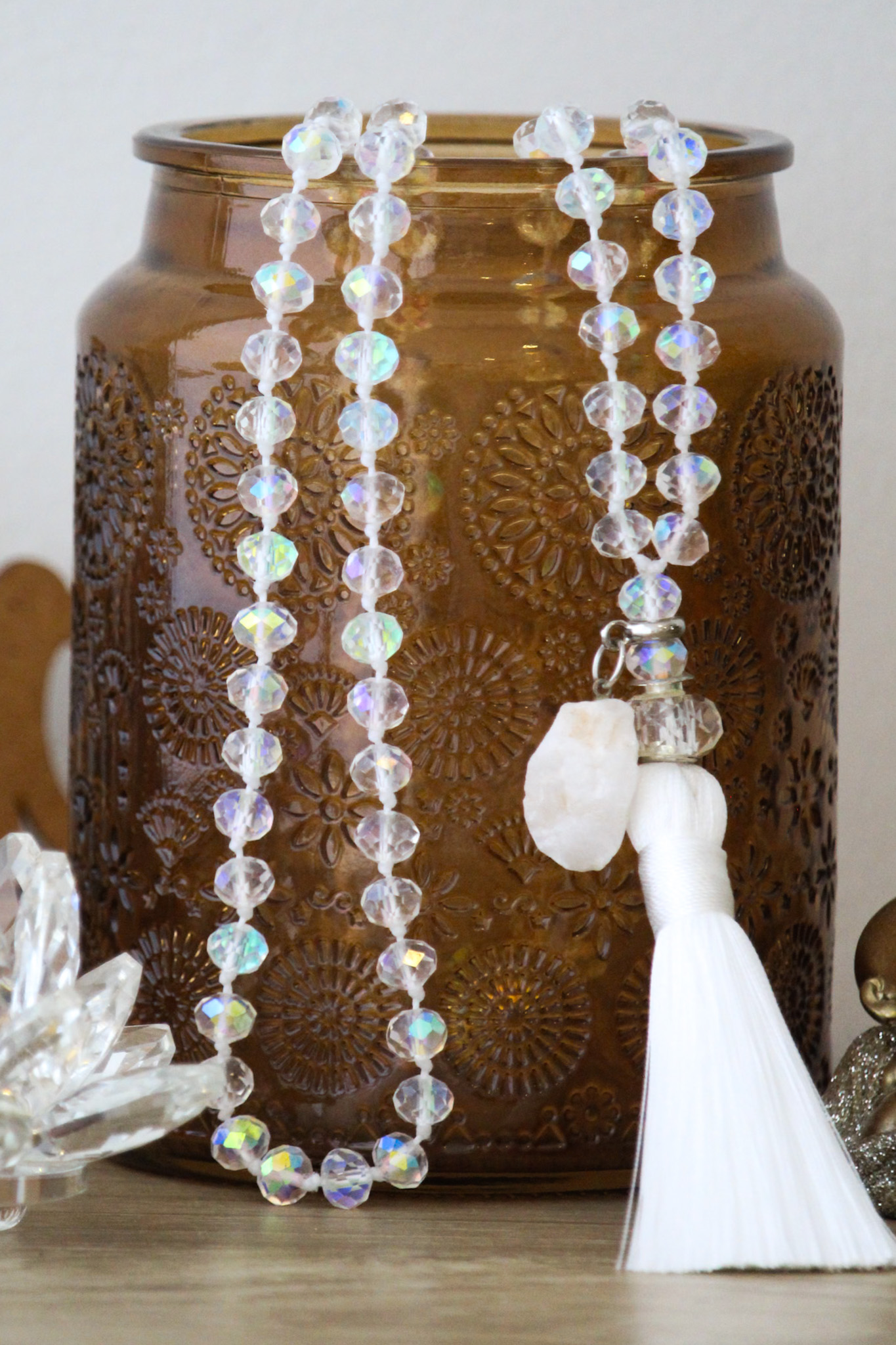 O japamala Aurora é uma linda peça feita com 108 contas de cristais em vidro branco translúcido que possui um brilho próprio, acompanhado de um pingente de quartzo branco. Os cristais translúcidos transmitem um efeito brilhante e luminoso, estando associados aos caminhos para a luz. A pedra quartzo branco é um cristal de sabedoria e cura, que purifica e protege de todos os ataques energéticos.