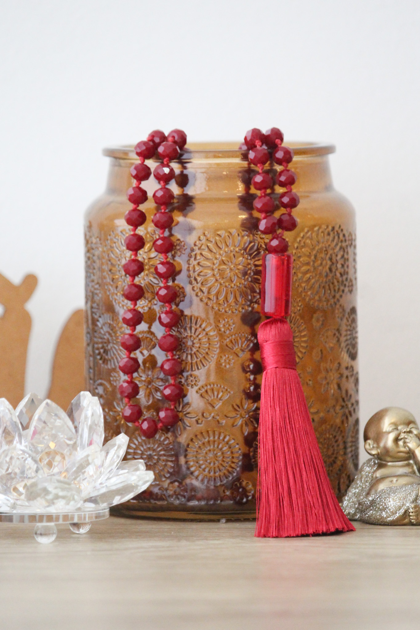 O japamala vênus é uma joia maravilhosa feita com 108 contas de cristais em vidro vermelho, uma peça perfeita para aumentar sua autoestima, confiança e amor-próprio.